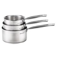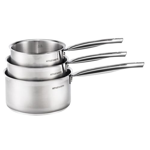 Batterie 3 casseroles 16/18/20 cm en inox avec poignées fixes. Revêtement intérieur en inox. Compatible au lave-vaisselle. Tous feux dont induction.
