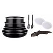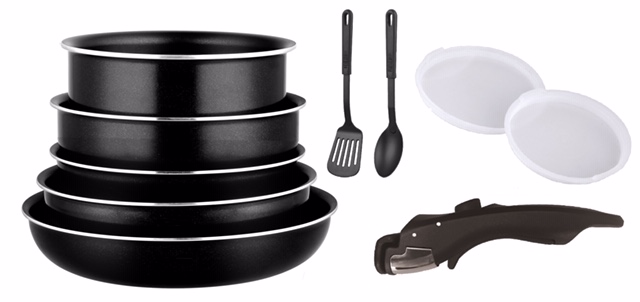 3 poêles de 20, 22 et 26 cm 2 casseroles de 16 et 18 cm une poignée 2 couvercles hermétiques de 16 et 18 cm 2 ustensiles en nylon