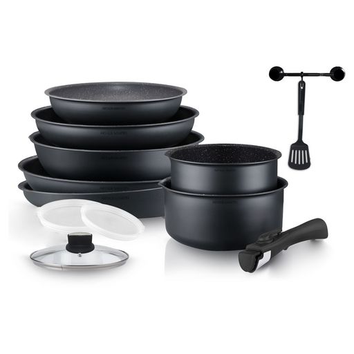 Batterie 12 pièces 3 poêles 20-24-28 2 casseroles 16-20 1 crêpière 28 1 sauteuse 24 1 couvercle en verre 24 2 couvercles hermétique 16-20 1 ustensile en nylon 1 poignée Aluminium 2,5 mm