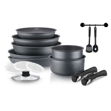 Batterie 15 pcs 3 poêles 20-24-28 3 casseroles 16-18-20 1 sauteuse 24 1 couvercle en verre 24 3 couvercles hermétique 16-18-20 2 ustensiles en nylon 2 poignées Aluminium 2,5 mm revêtement anti adhérent casseroles et sauteuse avec bec verseur