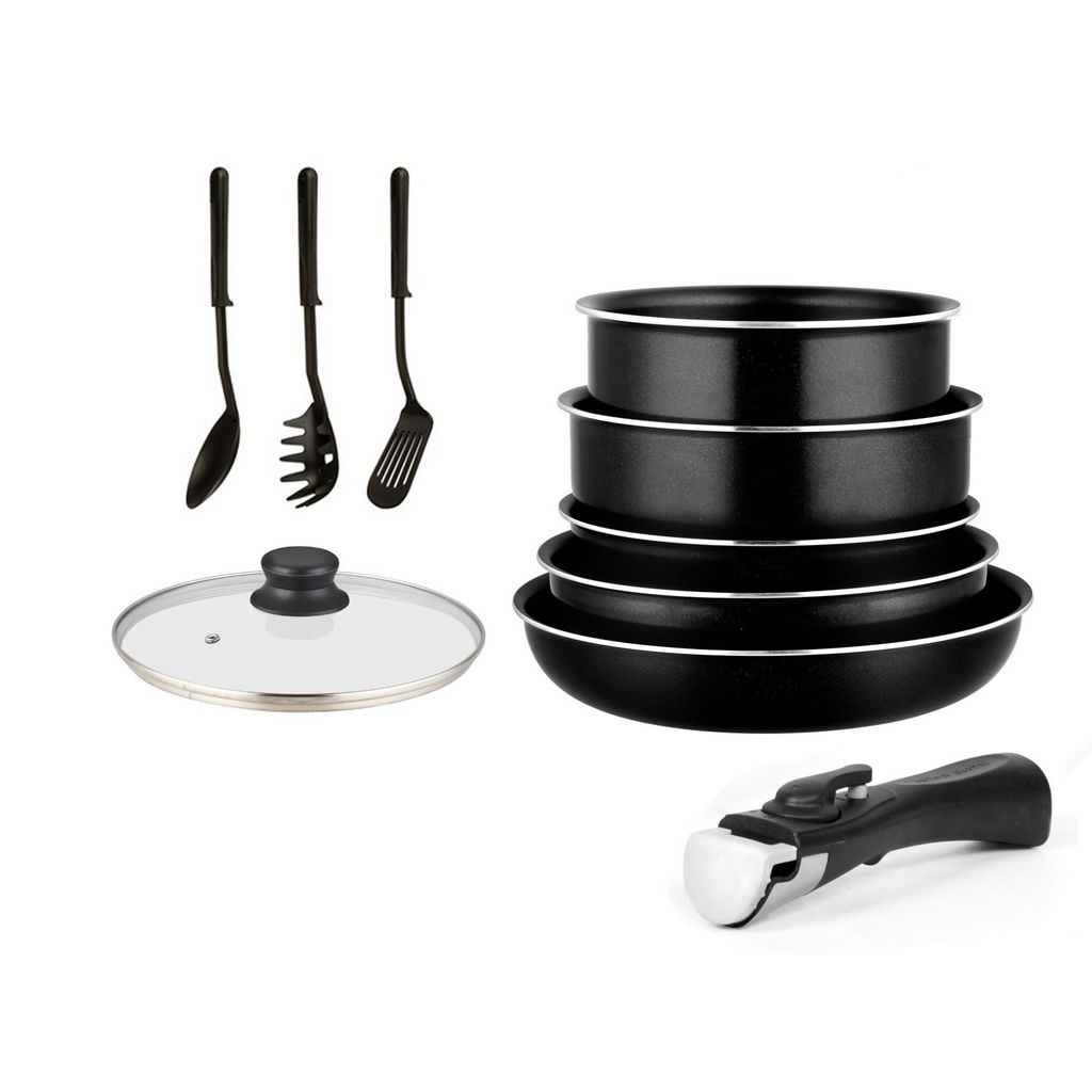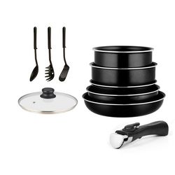 Batterie de cuisine 10 pièces avec poignée amovible et couvercles. Compatible tous feux, y compris induction. En aluminium forgé avec revêtement antiadhésif. Compatibilité lave-vaisselle. Comprend : 2 poêles (22/26 cm), 2 casseroles (16/20 cm), 1 sauteuse (24 cm), 1 couvercle en verre (24 cm), 1 poignée, et 3 ustensiles.