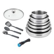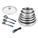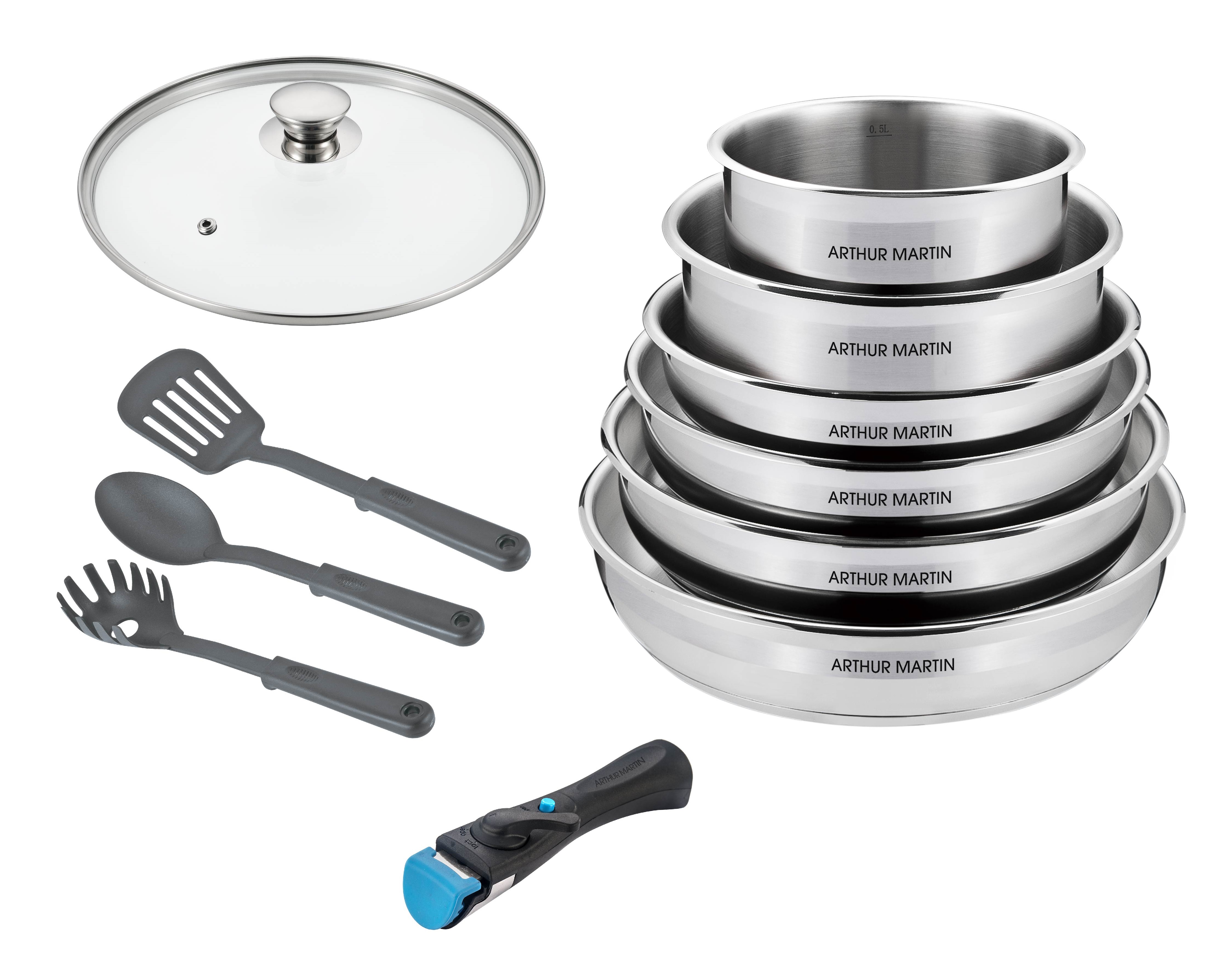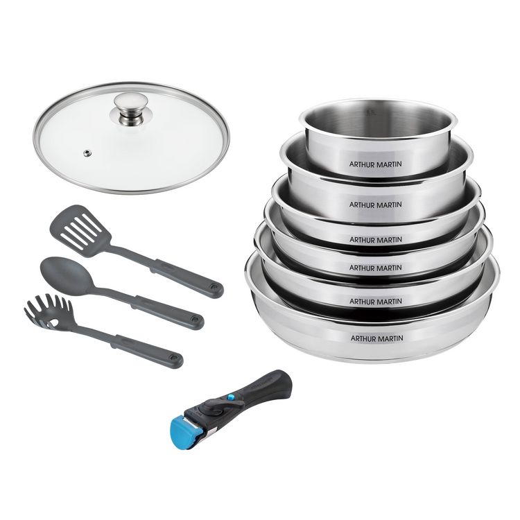 Batterie de cuisine de 11 pièces en inox. Poignée amovible. Compatible avec tous les feux dont l'induction. Compatible avec le lave vaisselle Composition : poêles 20-22-26 cm, casseroles 14-18 cm, sauteuse 24 cm, couvercles en verre 24 cm, 3 ustensiles, 1 poignée Revêtement intérieur et extérieur acier inoxydable