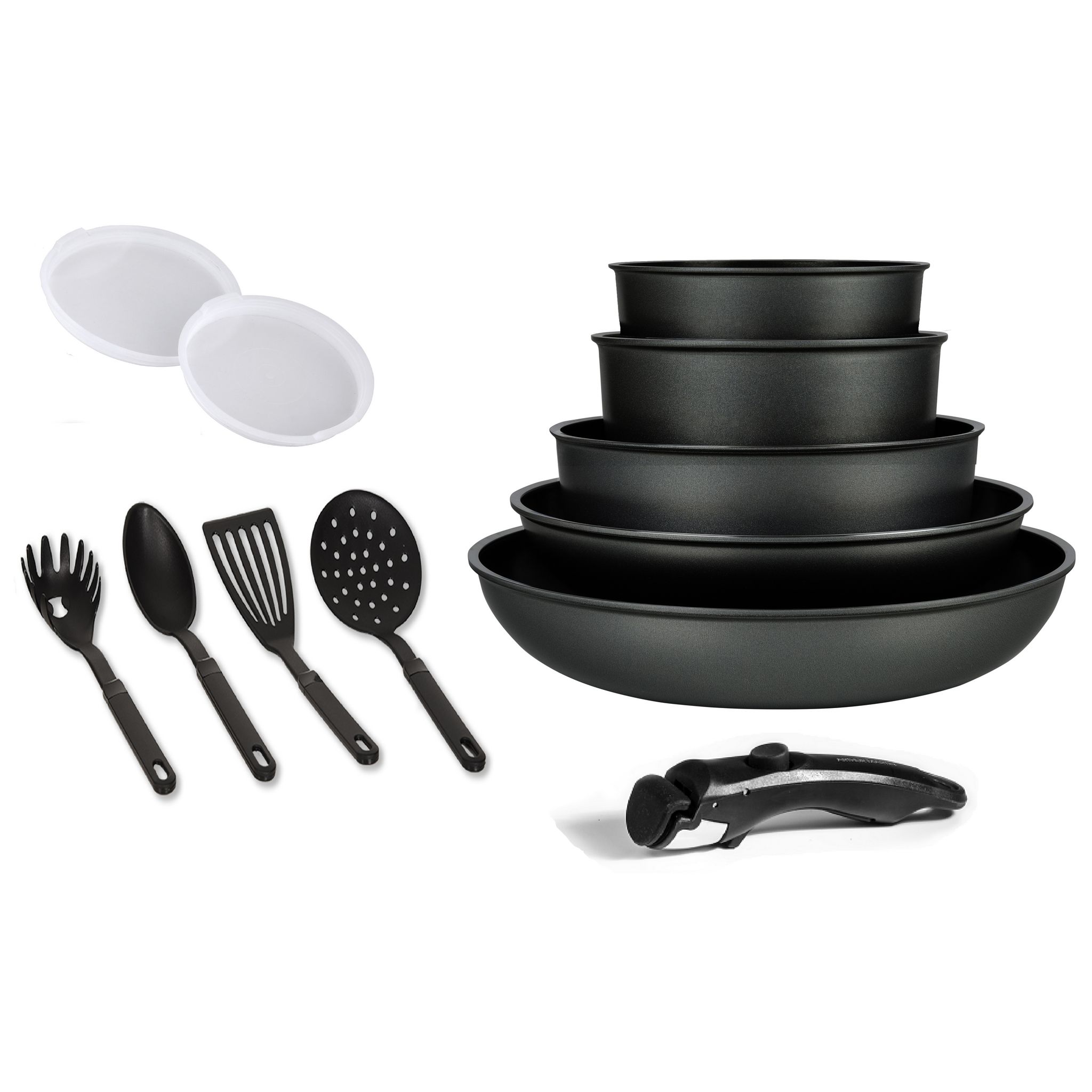 Batterie de cuisine effet pierre 12 pièces amovibles composée de 3 poêles 20-24-26 cm + 2 casseroles 16-20cm + 2 couvercles hermétiques 16-20 cm + 4 ustensiles en nylon + 1 poignée. Batterie en aluminium forgé, revêtement antiadhérent, tous feux dont induction.