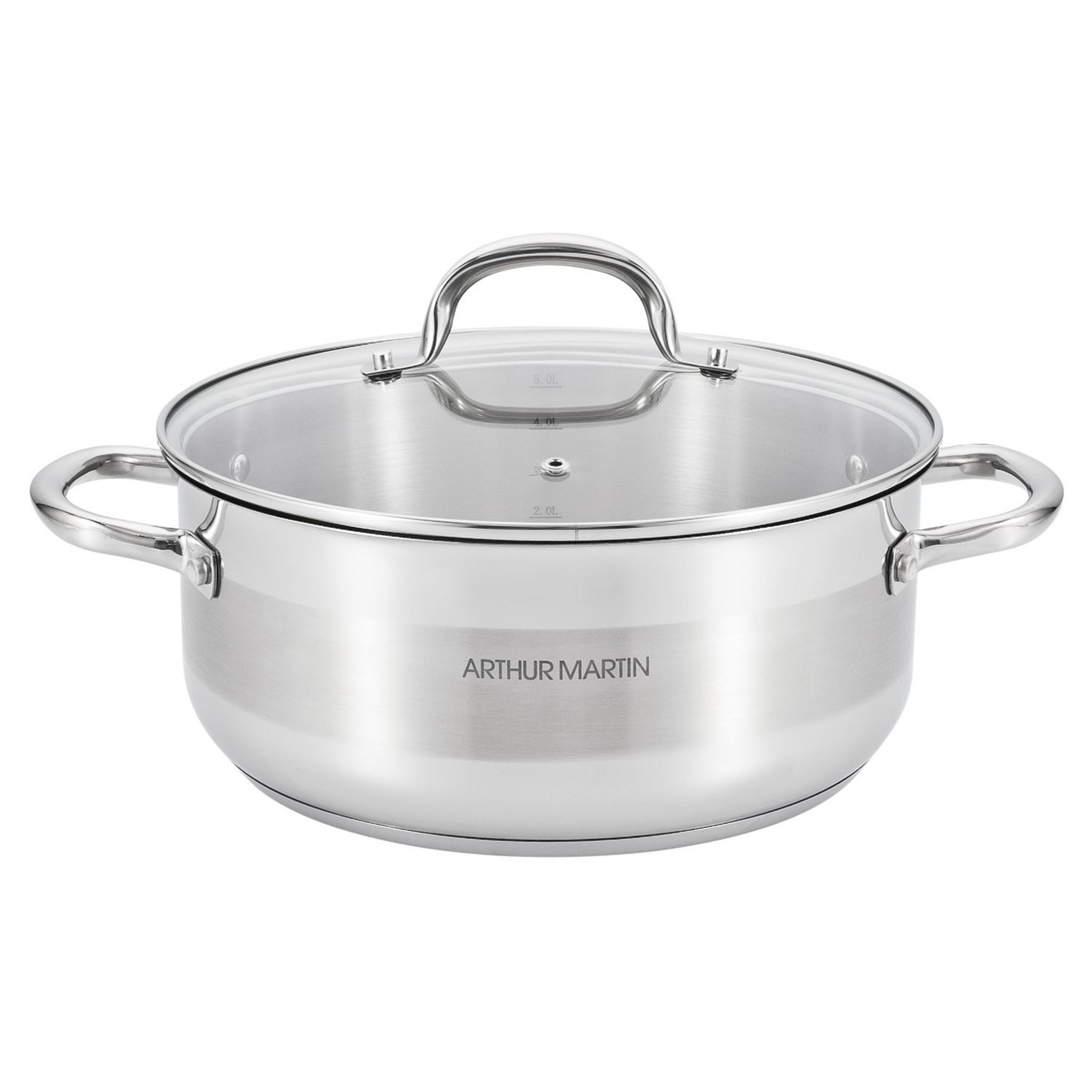 Faitout 24 cm de marque Arthur Martin tous feux dont induction est conçue en acier inoxydable, intérieur anti adhésif, poignée fixe. Compatible lave - vaisselle.