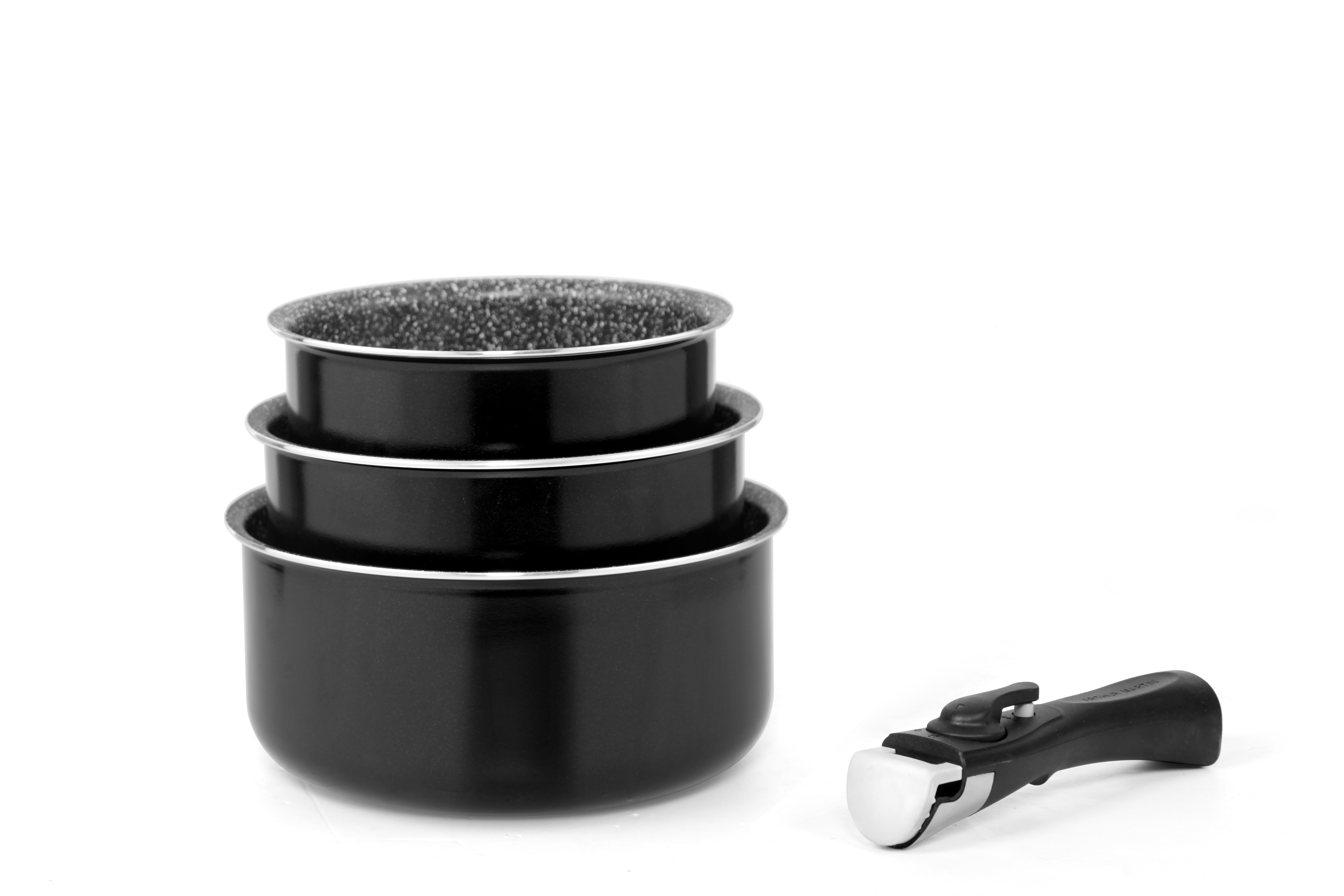 Découvrez ce set de 4 pièces composé de 3 casseroles de 16-18-20 cm et d'une poignée amovible avec sécurité. Le revêtement est anti adhérent sans pfoa. Compatible tous feux dont induction et four.