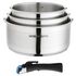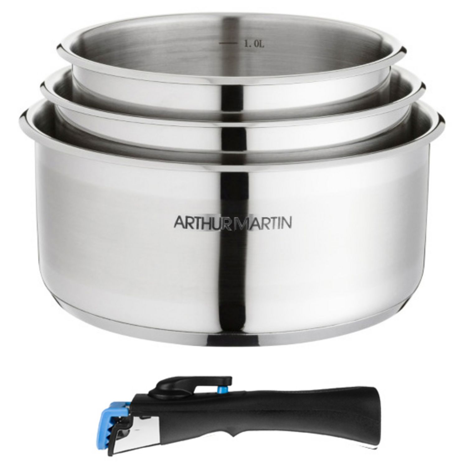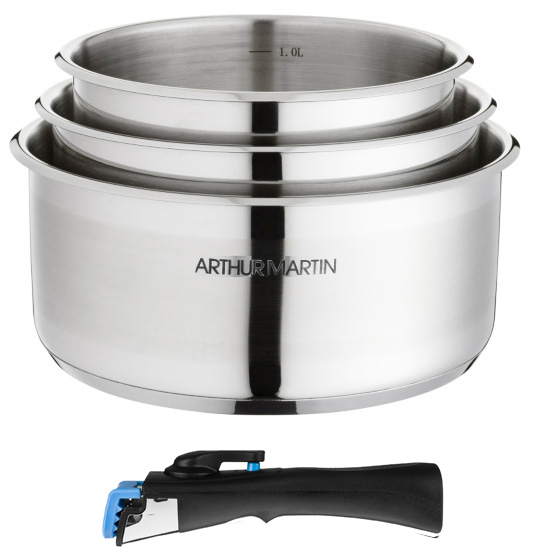 Un set de 3 casseroles signées ARTHUR MARTIN à poignée amovible, en acier inoxydable, idéal pour une cuisson saine, sans aluminium. Revêtement intérieur mat inox + extérieur inox brillant. Compatible tous feux dont induction.