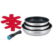 Set de 5 pièces amovible en inox Compatible au lave vaisselle Compatible avec tous les feux dont l'induction. Revêtement intérieur anti adhérent Composition ; - poêles 20-24-26 cm - 1 poignée - 2 protèges poêles
