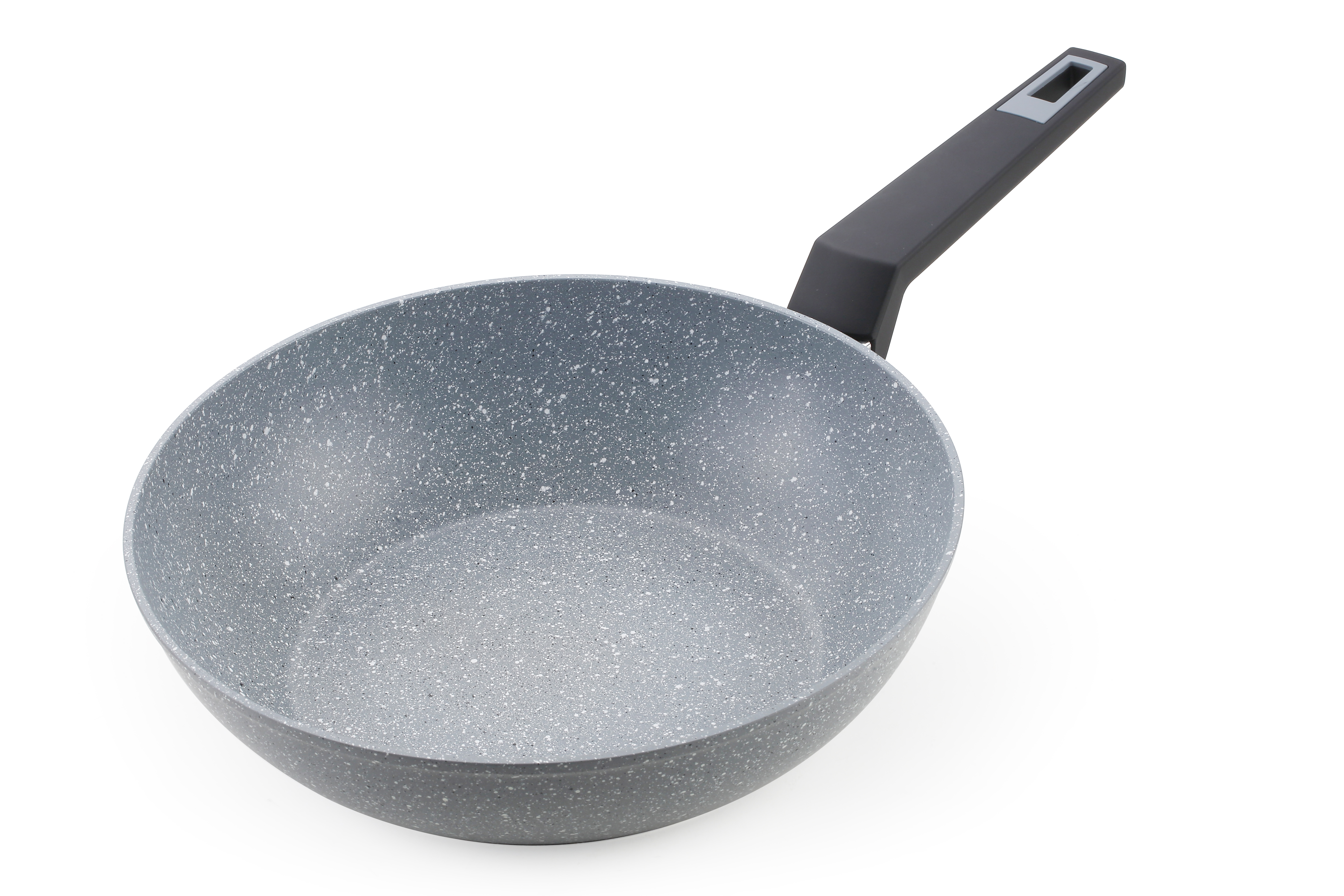 Wok 28cm moucheté gris en aluminium forgé tous feux dont induction ! Revêtement intérieur effet pierre antiadhérent pour éviter que les aliments collent. Poignée fixe.