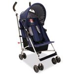 De 6 mois à 15 kg. -Châssis en acier. -Dossier réglable en 2 positions. -Repose-pieds fixe. -Serrure de transport. -Auvent avec fenêtre. -Frein arrière simple. -4 roues doubles. -Manche souple bicolore. -Panier en maille. -Harnais 5 points décoré.