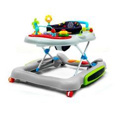 Siège pivotant à 360º (siège pivotant). Repose-pieds musical à 2 positions avec fonction de saut. Réglage de la hauteur à 3 positions. Plateau à jouets amovible avec musique/LED. Réglable en hauteur à 3 positions. Plateau à jouets avec 12 mélodies et lumière. Barre à jouets pour les jambes avec 5 mélodies et lumière. Roues en silicone avec fonction rotative. Tissu amovible et lavable. Six bouchons pour une utilisation plus sûre. Pliage très compact