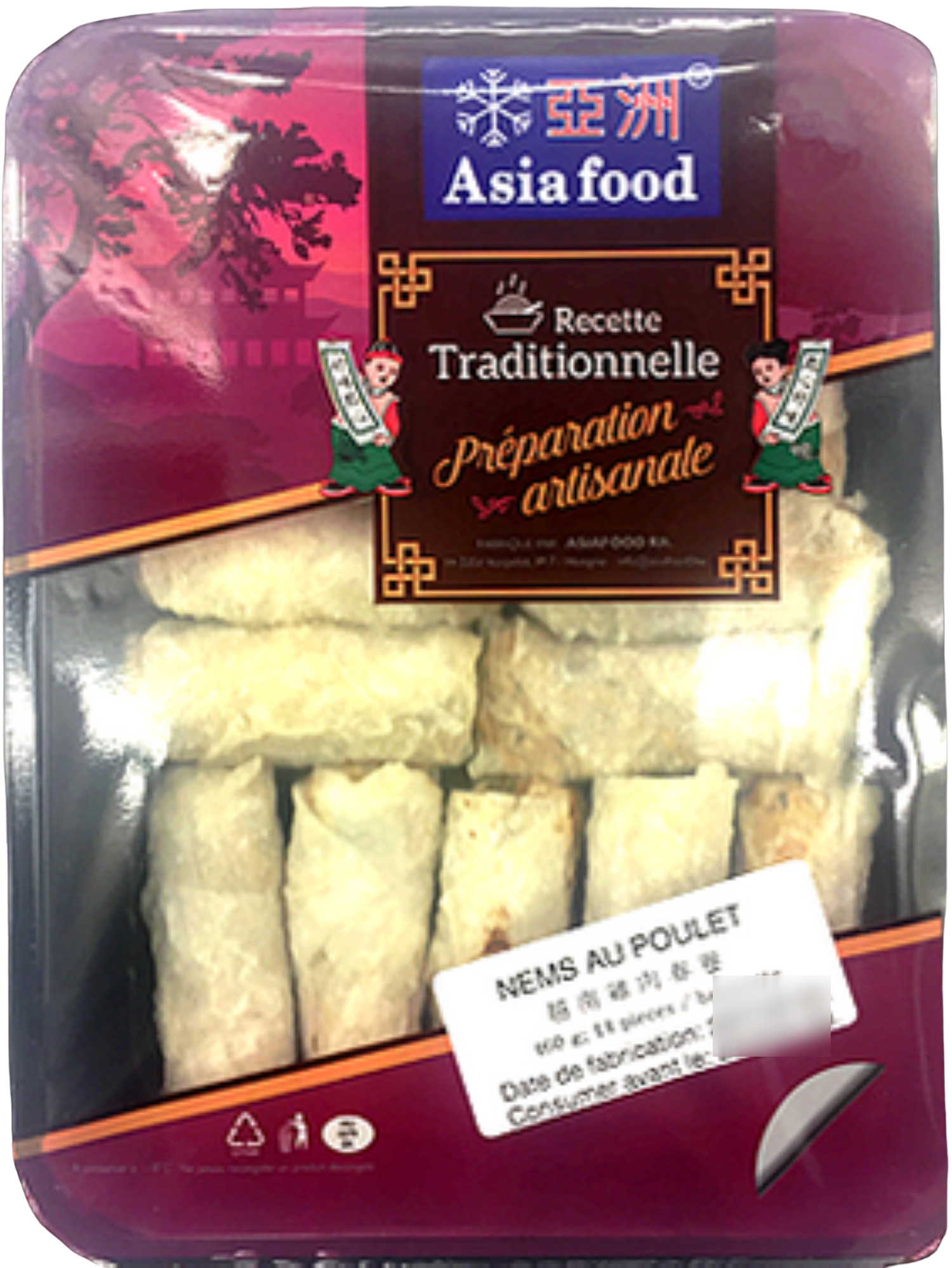 Ingrédients : Galette de riz (farine de riz, amidon de tapioca, eau, sel), viande de poulet ((27%,origine : UE)), oignons, chou, vermicelles de haricots mungo (haricots mungo, eau), carottes, champignons noirs (auricularia auricula-judae), fécule de pomme de terre , sucre, exhausteur de goût (E621), épices, sel, huile de tournesol, huile de sésame, sauce poisson (extrait d’anchois, eau, sel, sucre)