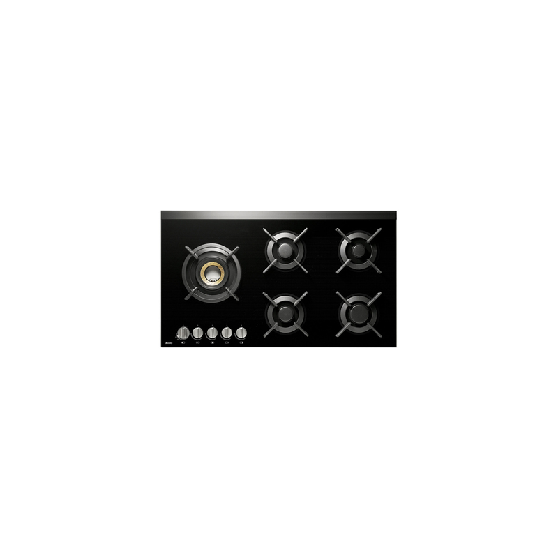 Avantages produits : Table à gaz 90 cm-Verre vitrocéramique- 4 brûleurs monoblocs A+ et 1 brûleur Volcan Fusion Wok exclusif-Allumage électronique-Grilles en fonte.