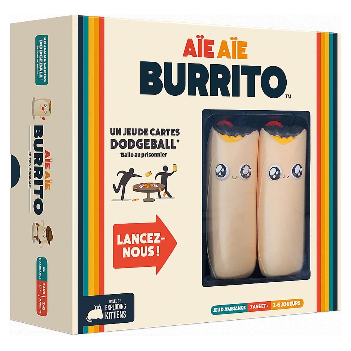 Aïe Aïe Burrito, c'est ce que vous obtenez lorsque vous croisez un jeu de cartes avec la balle au prisonnier. Essayez de rassembler des cartes identiques plus rapidement que vos adversaires tout en esquivant et en lançant des burritos aériens. Les cartes que vous accumulez rapportent des points, mais si vous êtes touché par des burritos volants, vous les perdez. Alors, faites de la place et rangez les antiquités, car vous n'avez jamais joué à un jeu de cartes comme celui-ci auparavant !. Comment ça marche ?. Placez une paire de burritos sur une table et tirez des cartes. Gardez vos cartes secrètes. Faites des points en trouvant des séries de trois dans le jeu. Trouvez des combinaisons avant que quelqu'un d'autre ne le fasse. Si quelqu'un joue des cartes burritos, une bataille s'ensuit. Volez des points à vos adversaires en les frappant avec des burritos en peluche. Déclarez la guerre à vos amis. Certaines batailles n'impliquent qu'une poignée de joueurs. D'autres obligent toute la table à s'engager dans une guerre de burritos. Faites un duel pour déterminer le vainqueur. Lors d'un duel de burritos, deux joueurs doivent se tenir dos à dos, faire trois pas et faire un feu.