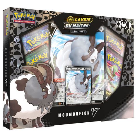Avec ce Coffret Pokémon - La Voie Du Maître - Moumouflon-V tu vas pouvoir berner ton adversaire lors de ton prochain duel ! Moumouflon ressemble peut-être à une peluche, mais ne t'y trompe pas, il possède des attaques effrayantes. La laine chaude et épaisse de Moumouflon-V le protège des attaques ! Au combat, Moumouflon-V est implacable et tenace, loin du doux caractère des autres Pokémon duveteux. Cette collection combine le côté doux et féroce de Moumouflon-V sur une carte pour le jeu et sur une carte grand format, et recèle des trésors de l'extension spéciale La Voie du Maître.
