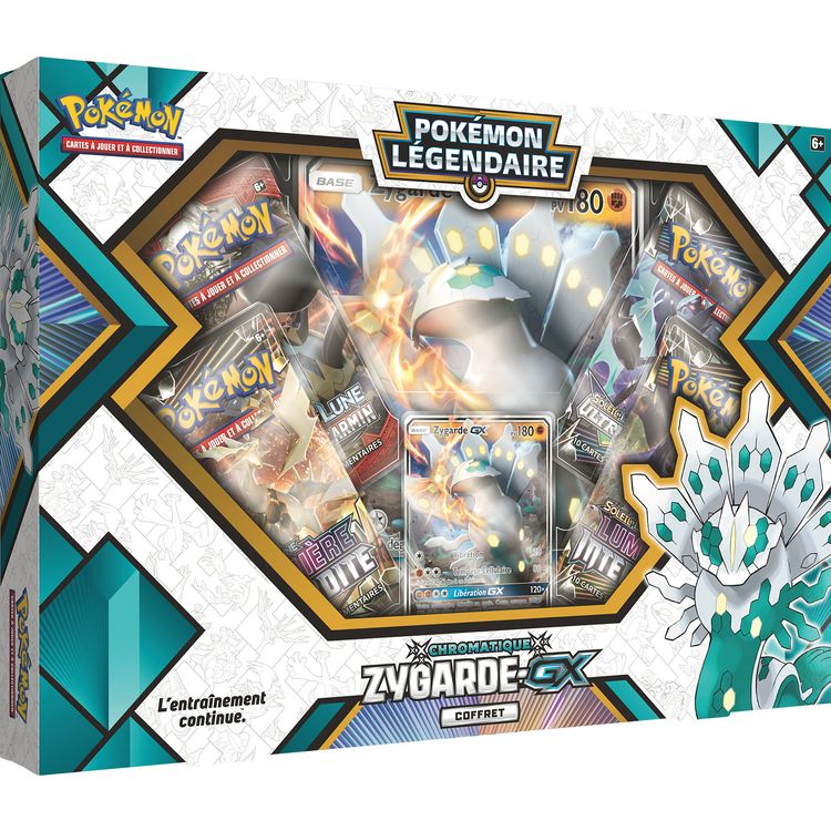 Chaque pack contient 4 boosters Soleil & Lune, 1 carte promo Zygarde GX, 1 carte géante Zygarde GX et 1 carte à code.