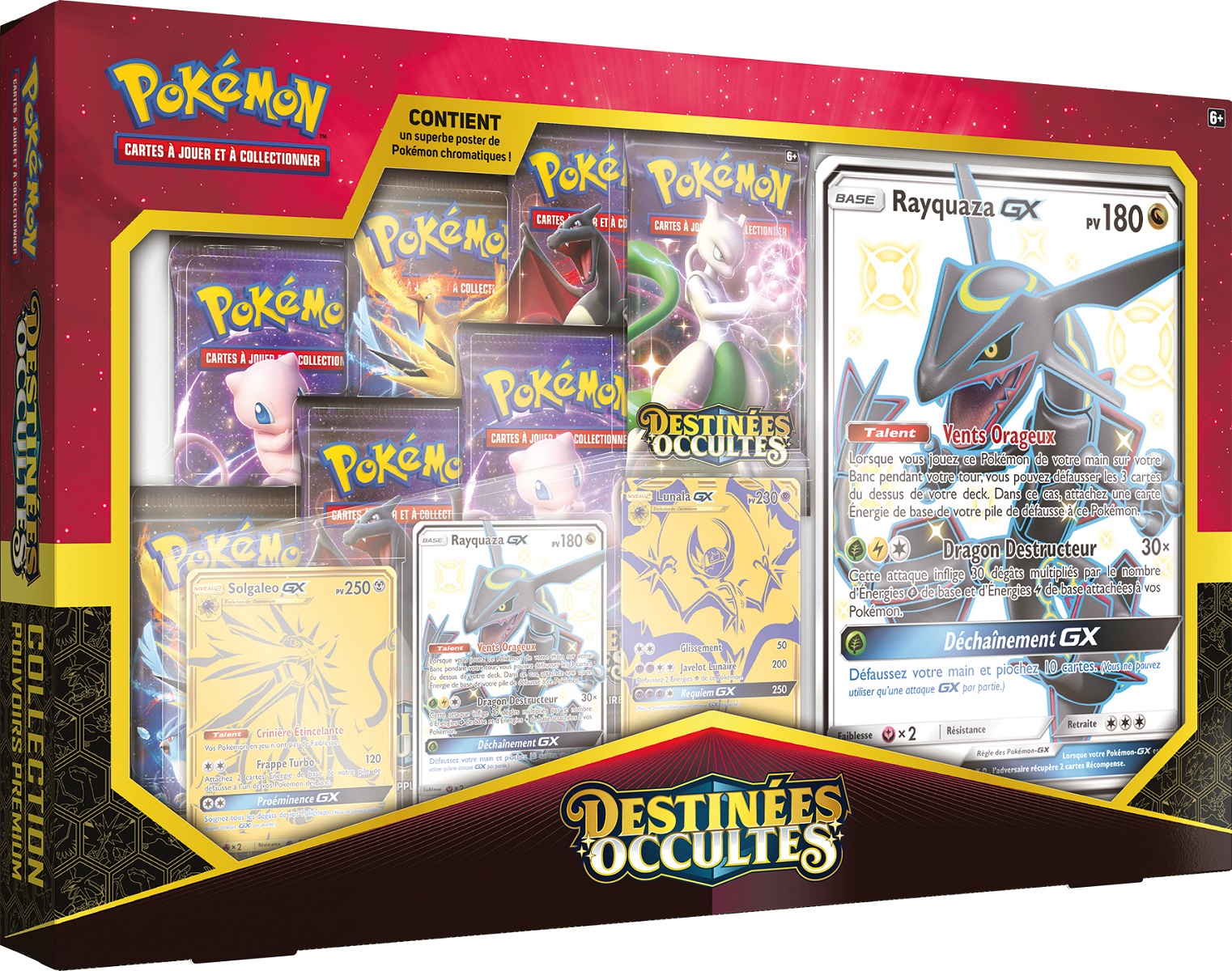 Retrouve le légendaire Rayquaza GX dans ce coffret Pokemon, Soleil et Lune 11.5 Destinées Occultes. Ce coffret Pouvoirs Premium contient 3 cartes promo brillantes de Rayquaza GX, Lunala GX et Solgaleo GX, 1 carte grand format brillante de Rayquaza GX, ainsi que 7 boosters Soleil et Lune 11.5 Destiné