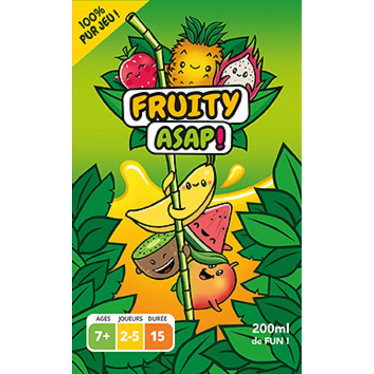Fruity ASAP est un jeu de rapidité dans lequel les joueurs tentent de reproduire un maximum de Cascades de fruits pour gagner la partie. Reconstituez les cascades de fruits en tournant et en assemblant vos cartes aussi vite que possible ! Le premier qui obtient la configuration demandée remporte la carte.