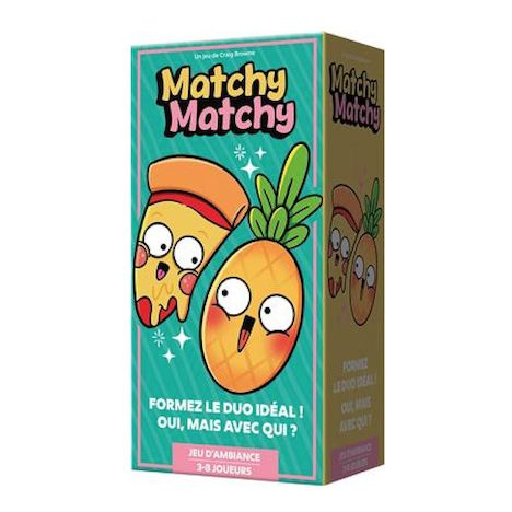 Matchy Matchy est un jeu d'ambiance délirant où votre mission est simple : choisir les mêmes images que votre équipier pour prouver à quel point vous êtes sur la même longueur d'onde ! Chaque équipe joue avec un paquet de 42 cartes Image identiques, illustrant toutes sortes de situations étranges, drôles ou complètement absurdes. Un thème est tiré au hasard, et chacun doit secrètement sélectionner les images les plus pertinentes? ou les plus inattendues. À chaque tour, vous comparez vos cartes avec celles de votre partenaire : plus vous êtes synchronisés (même image, même ordre), plus vous avancez sur le plateau. Soyez l'équipe la plus synchro pour atteindre la dernière case avant les autres duos. Le duo le plus connecté atteindra la dernière case en premier !. Avec 576 thèmes différents, des parties de 30 minutes et un matériel coloré et qualitatif, Matchy Matchy est parfait pour des sessions pleines de rires, en famille ou entre amis. Il se joue aussi bien à 4 qu'à 8, en équipes fixes ou avec un référent si vous êtes en nombre impair. Vos goûts (bons ou très discutables) parleront pour vous !