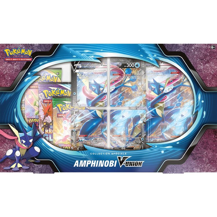 4 cartes promo composant un Pokémon-V-UNION : Mewtwo-V-UNION, Amphinobi-V-UNION ou Zacian-VUNION, 1 carte grand format du Pokémon-V-UNION en vedette, 1 carte Supporter de Professeure Pimprenelle, 4 boosters du JCC Pokémon, 1 carte à code pour le JCC Pokémon Online.