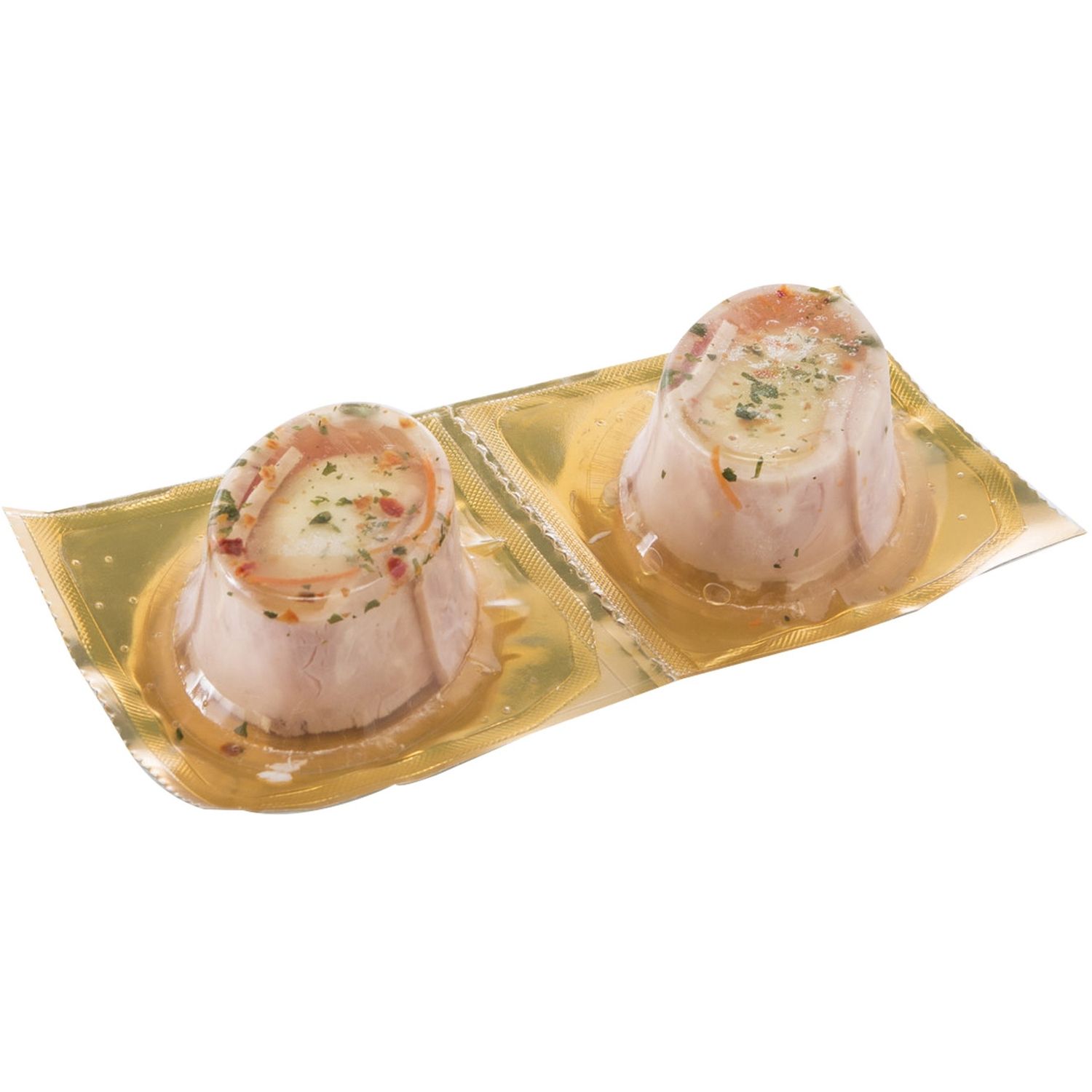 Véritable Aspic Oeuf avec un œuf mollet entier accompagné de jambon et de dés de tomates ASPIC OEUF POCHE JAMB X2 180G