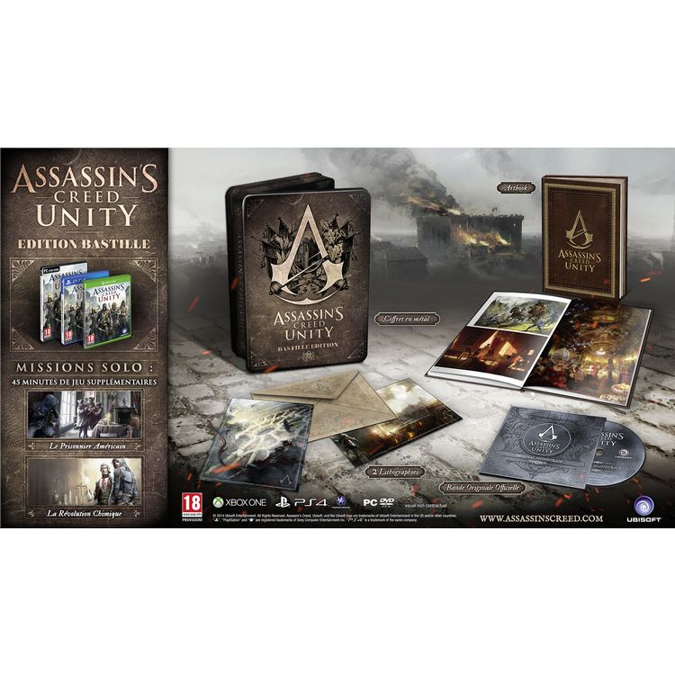 La prise de la Bastille est l'évènement le plus emblématique de la Révolution française. Elle est la première étape marquante du peuple dans son combat contre l'injustice. L'édition Bastille d'Assassin's Creed Unity est faîte pour ceux qui se sentent révolutionnaire dans l'âme et qui auraient été prêts à se battre pour leur liberté. En plus du jeu, cette édition contient un Artbook, 2 lithographies et la Bande Originale Officielle du jeu. Vous aurez également accès à 2 missions solo supplémentaires d'une durée de 45 minutes !