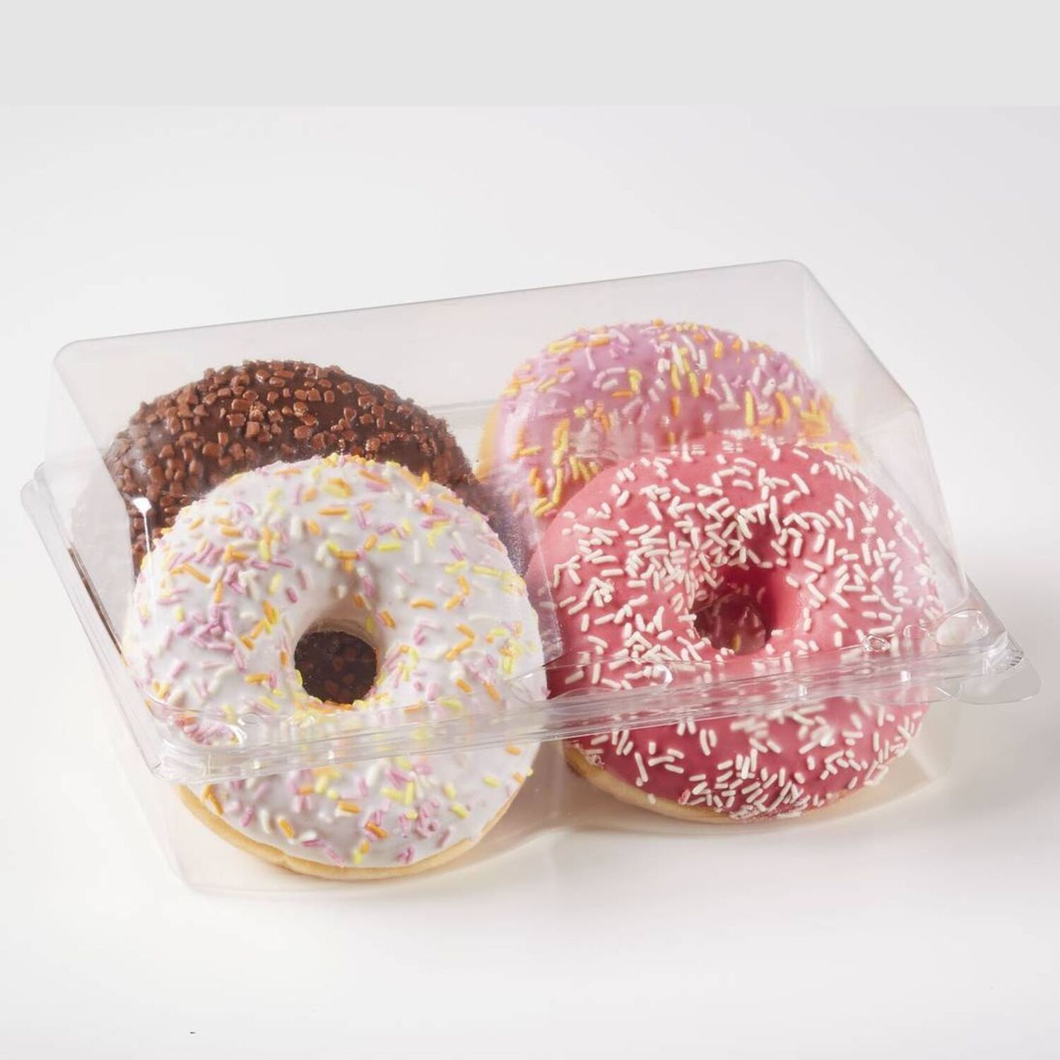 DONUT ROSY +/‐ 55g: donut enrobé d'un nappage (12,5%) au goût fraises, décoré avec des vermicelles multicolores (7%).