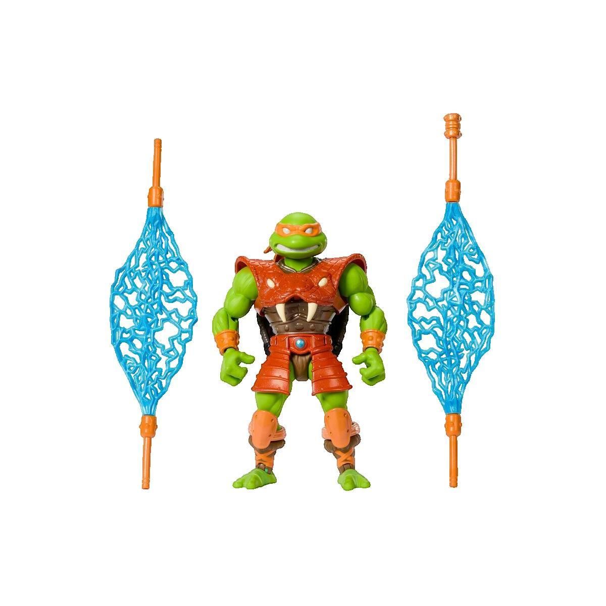La figurine d'action Michelangelo de la marque Aster est un produit de collection idéal pour les fans des Tortues Ninja et MOTU. Elle mesure 14 cm de hauteur et possède 16 articulations mobiles permettant diverses poses d'action. La figurine est équipée d'accessoires tels que des nunchakus connectab