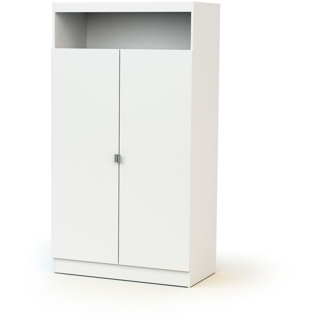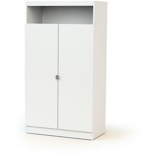 Armoire deux portes et une niche. Une armoire aux belles dimensions pour une chambre d’enfant toujours bien rangée. Moderne et très pratique grâce à une penderie, des étagères réglables en hauteur et une niche ouverte en partie haute.4 étagères réglables en hauteur dont 1 avec penderie. Ce meuble doit être fixé au mur pour éviter les risques de basculement. Choisissez vos fixations en fonction de vos murs (vendues séparément).Livré en kit, à monter soi-même..