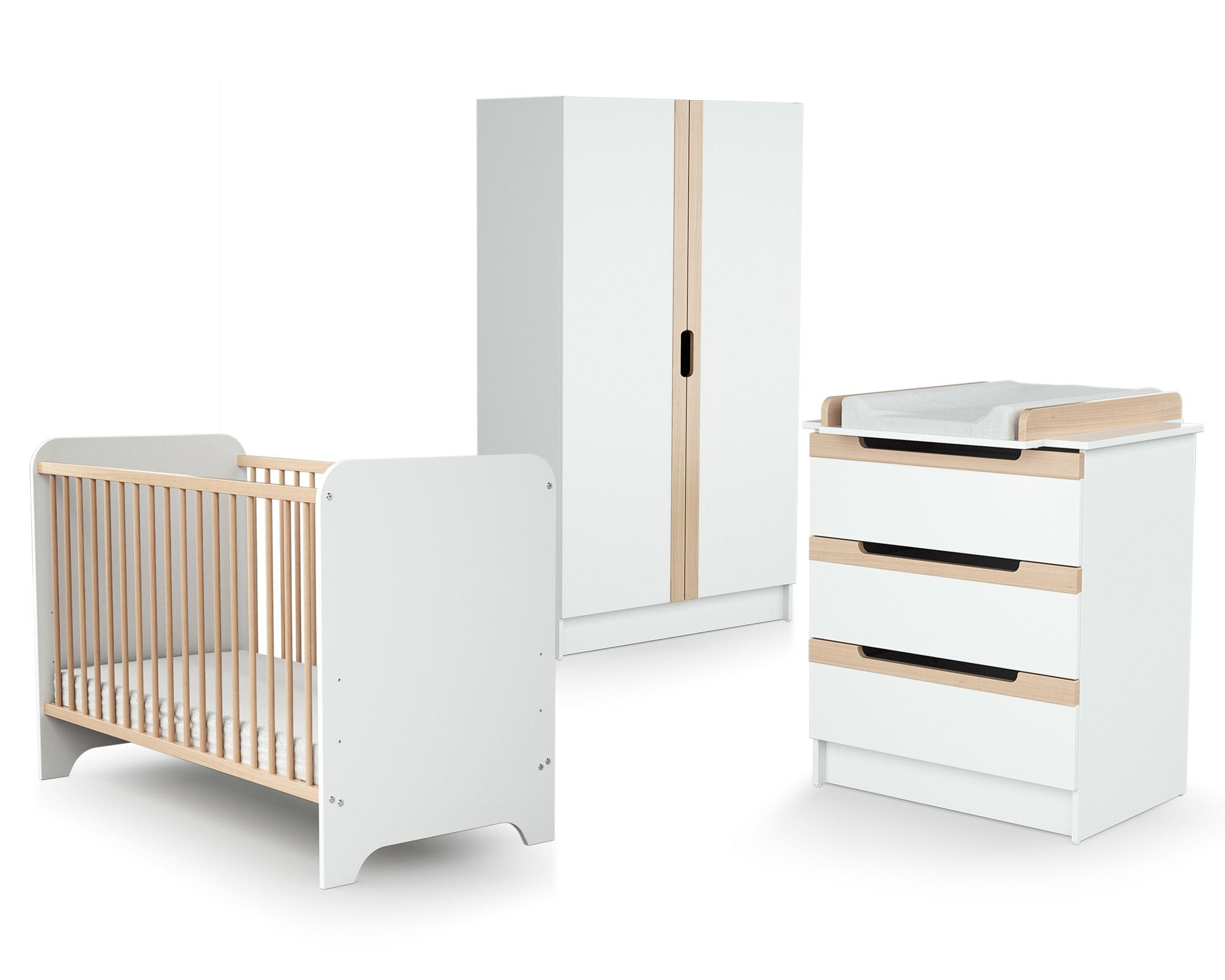 Chambre bébé lit, commode à langer et armoire Blanc et Hêtre Verni
