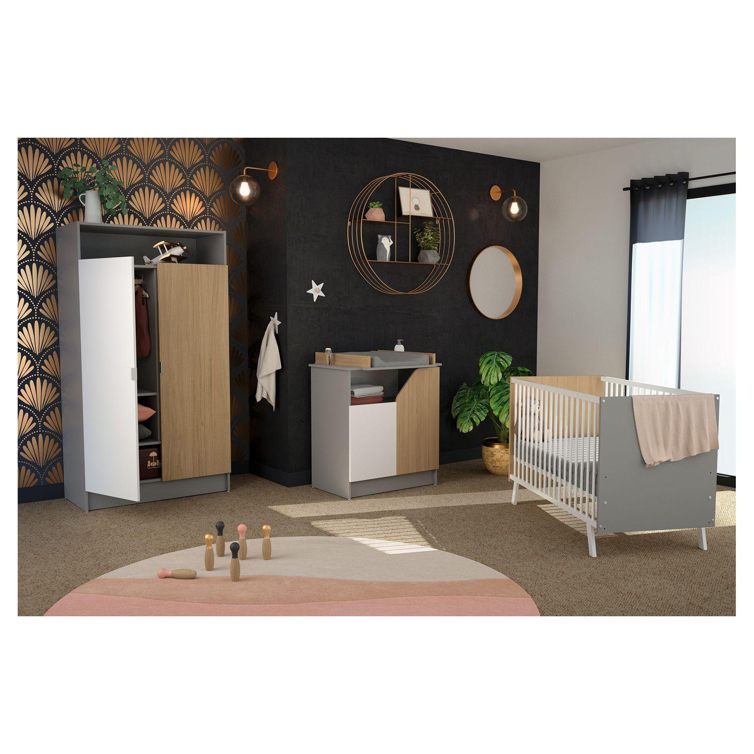 Chambre complète CARNAVAL Blanc, Gris et Chêne : Lit 60x120 cm + Commode À Langer + Armoire