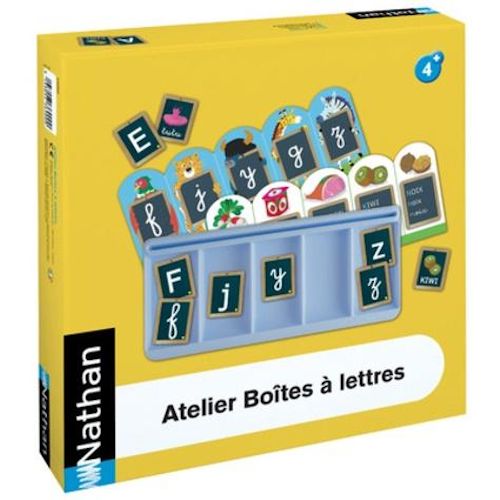 L'atelier d'entraînement Boîtes à lettres pour 2 enfants permet de développer les compétences liées à la reconnaissance des lettres de l'alphabet et à la découverte du principe alphabétique. Un atelier ludique pour apprendre les lettres de l'alphabet (fans les 3 graphies) et préparer l'acquisition du principe alphabétique. Chaque enfant dispose d'une boîte à lettres dans laquelle est insérée une fiche consigne. A l'aide des jetons correspondants, il doit compléter les cases de la boîte en respectant chaque consigne. Par l'observation et la manipulation de jetons-lettres et de jetons-mots, les élèves prennent conscience qu'une même lettre peut être représentée de plusieurs façons et qu'un mot est constitué de plusieurs lettres, dans un ordre précis. Le livret pédagogique présente les objectifs, l'organisation des séries et propose plusieurs pistes d'activités : avec les jetons seuls, avec les fiches seules ou avec l'ensemble du matériel. PROGRESSION DES ACTIVITES Elles s'organisent autour de 36 fiches consignes réparties en 6 séries de 6 fiches. Dans les deux premières séries, les lettres sont regroupées par similitude graphique. Série rose : lettres capitales. Série bleue : lettres cursives. Série orange : lettres en script. Série violette : les 3 écritures des lettres. Série verte : les 3 écritures d'un mot. Série rouge : la composition d'un mot. COMPETENCES DEVELOPPEES Apprendre les lettres de l'alphabet dans les trois graphies : capitale, cursive, script. Comprendre qu'un mot est constitué de plusieurs lettres. Reconnaître la première lettre et la dernière lettre d'un mot. Savoir composer un mot (4 lettres). Conseil accompagnement du handicap : Jeu adapté à de nombreuses activités de reconnaissance et d'apprentissage des lettres de l'alphabet dans les 3 écritures (capitale, cursive, minuscule). Les fiches s'insèrent verticalement dans les boîtes.
