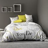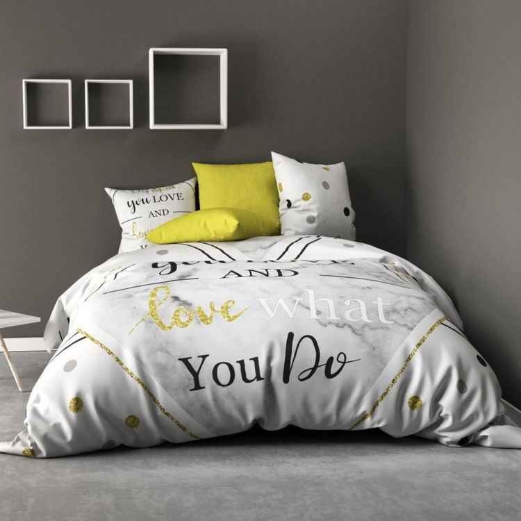 Très belle housse de couette WHAT pour lit 2 personnes de dimensions 240x220 cm en 100% coton finition pressions avec ses 2 taies d'oreillers 63x63 cm.Dimensions housse de couette : 240x220 cmDimensions des taies d'oreiller : 63x63 cmFinition : housse de couette finition pressionsMatière : 100% coton 47 fils/cm² En coton, un tissu souple et résistant de qualité supérieure grâce à son tissage ultra serré (47fils/cm2) constitué de fils de coton. Plus le nombre de fils au cm2 est élevé, plus le tissage est de qualité.Housse de couette et taies d'oreiller lavable à 40 degrés.Produit certifié Oeko-Tex, le label garantit que les articles testés et certifiés ne présentent pas de substances nocives pouvant nuire à la santé.