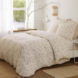 Apportez une touche de sérénité et de raffinement à votre chambre avec cette parure de couette en gaze de coton non froissée.Son tissu doux, respirant et naturellement texturé vous enveloppe de confort pour des nuits apaisantes en toute saison.Le fond beige chaleureux est délicatement orné d'un motif feuillage au trait fin bleu, pour un style à la fois graphique, naturel et épuré. Une parure idéale pour créer une ambiance zen, douce et lumineuse dans votre intérieur!Informations sur la parure de couette imprimée 3 pièces:1 housse de couette 240x220cm imprimée avec boutonnière dissimulée2 taies d'oreiller 63x63 cmMatière : 100% gaze de coton non froisséLavage machine recommandé à 30 degrés, ne pas blanchir, ne pas sécher en machine et ne pas nettoyer à sec.Produit certifié Oeko-Tex, le label garantit que les articles testés et certifiés ne présentent pas de substances nocives pouvant nuire à la santé.