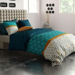 Faites confiance à cette parure de couette pour prendre soin de vos nuits. Composée à 100% de coton certifiée Oeko-Tex, tissu souple et résistant de qualité supérieure grâce à son tissage ultra serré (57 fils/cm²), qui vous permettra de bien dormir en toute sérénité.Information sur la parure de couette imprimée en coton :Dimensions housse de couette : 260x240 cmDimensions oreillers : 63x63 cmFinition : housse de couette boutons et taie portefeuilleMatière : 100% coton 57 fils/cm²Standard qualité OEKO-TEXEntretien : Housse de couette et taie d'oreiller lavable à 40°CLaver et repasser sur l'envers afin de protéger les couleurs.