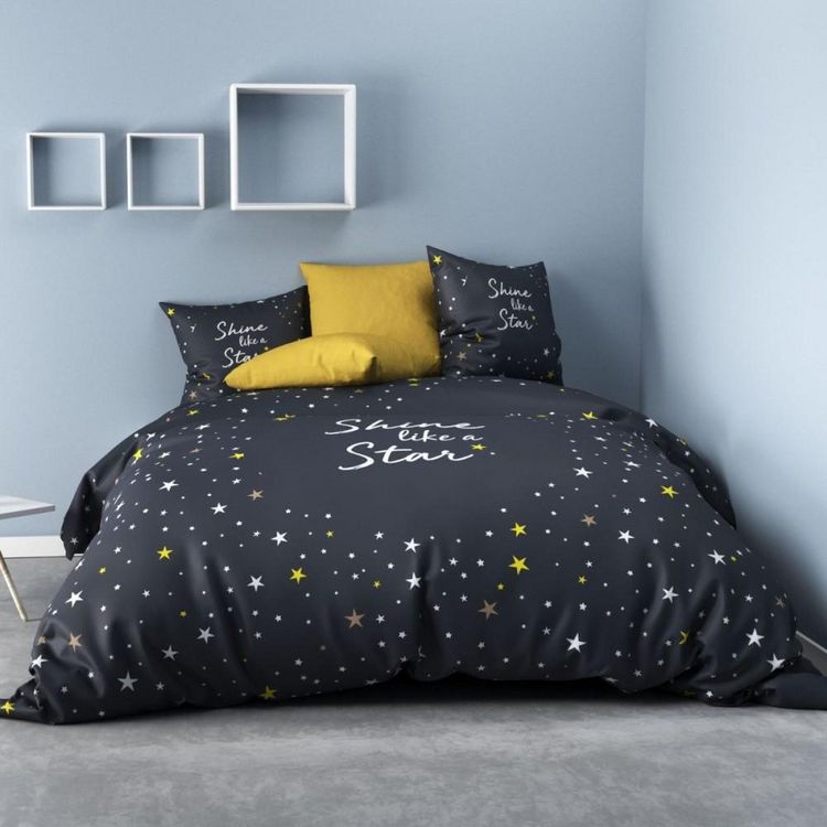 Très belle housse de couette GALAXY pour lit 2 personnes de dimensions 260x240 cm en 100% coton finition pressions avec ses 2 taies d'oreillers 63x63 cm.Dimensions housse de couette : 260x240 cmDimensions des taies d'oreiller : 63x63 cmFinition : housse de couette finition pressionsMatière : 100% co