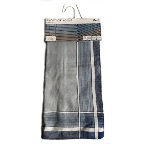 Lot de 6 mouchoirs homme BASILE 40x40 cm 100% coton. Nous vous proposons ce lot de 6 mouchoirs pour homme grand format, de dimensions 40 x 40 cm fabriqués en 100% coton. Modèles assortis. Lavable à 60°C doux.(Ensemble composé de 2 lots de 3 mouchoirs, chaque lot comprend 3 couleurs assorties)