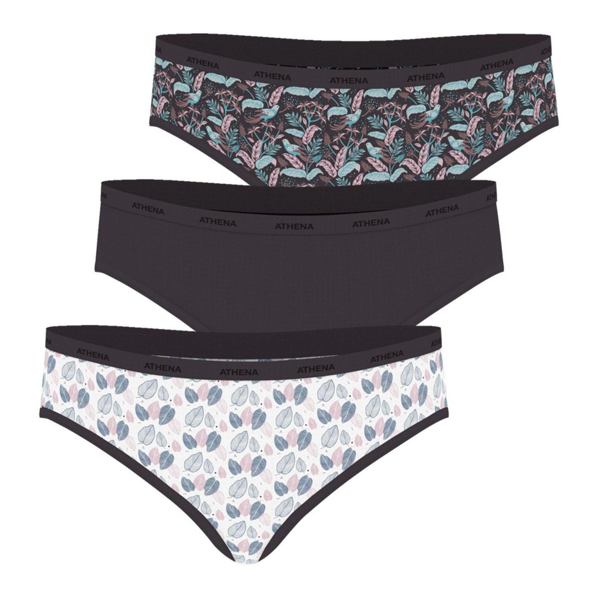 Caracté,ristiques de ce lot de 3 slps ATHENA MODE ECOPACK ,Lot de 3 slips2 imprimé,s associé,s à, un uniCoton stretch ultra douxElastique logoté, ATHENA à, la tailleSans é,tiquette, sans gê,ne, sans irritationDisponible de la taille 36/38 à, 4