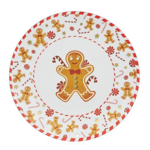 Informations Techniques : Dimensions : D. 33 x H. 1,3 cm Matière : Polypropylène Spécificités : Pratique & Festif Assiette de présentation déco Design Bonhomme pain d'épice Forme ronde Poids : 0,32 kg Couleur : Blanc