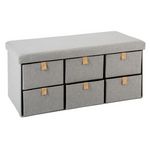 Informations Techniques : Dimensions : L. 76,5 x l. 38 x H. 38 cm Matières : MDF, Mousse PU & Polyester Spécificités : Moderne & Design 6 tiroirs Banquette Pliable A monter soi-même Poids : 8,8 kg Couleur : Gris