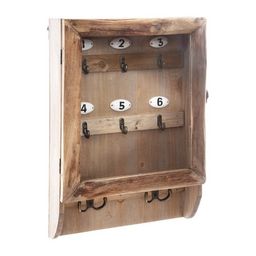 Boîte à clés rétro en boisCréez une décoration à la fois originale tout en étant très utile grâce à cette boîte à clés rétro en bois au look très vintage. Ambiance milieu du siècle dernier pour cette jolie boite à clés rétro avec ses 6 crochets pour ranger les clés et 2 crochets pour y suspendre des vêtements. Information sur la boîte à clés rétro en bois :Dimensions : L. 26 x l. 8,5 x H. 38 cmMatière : fer, verre, sapinPoids : 1,4 kg