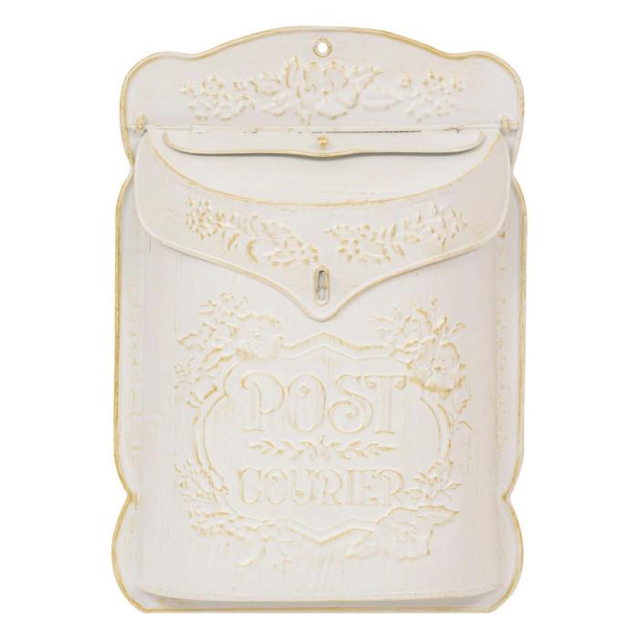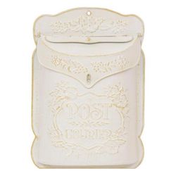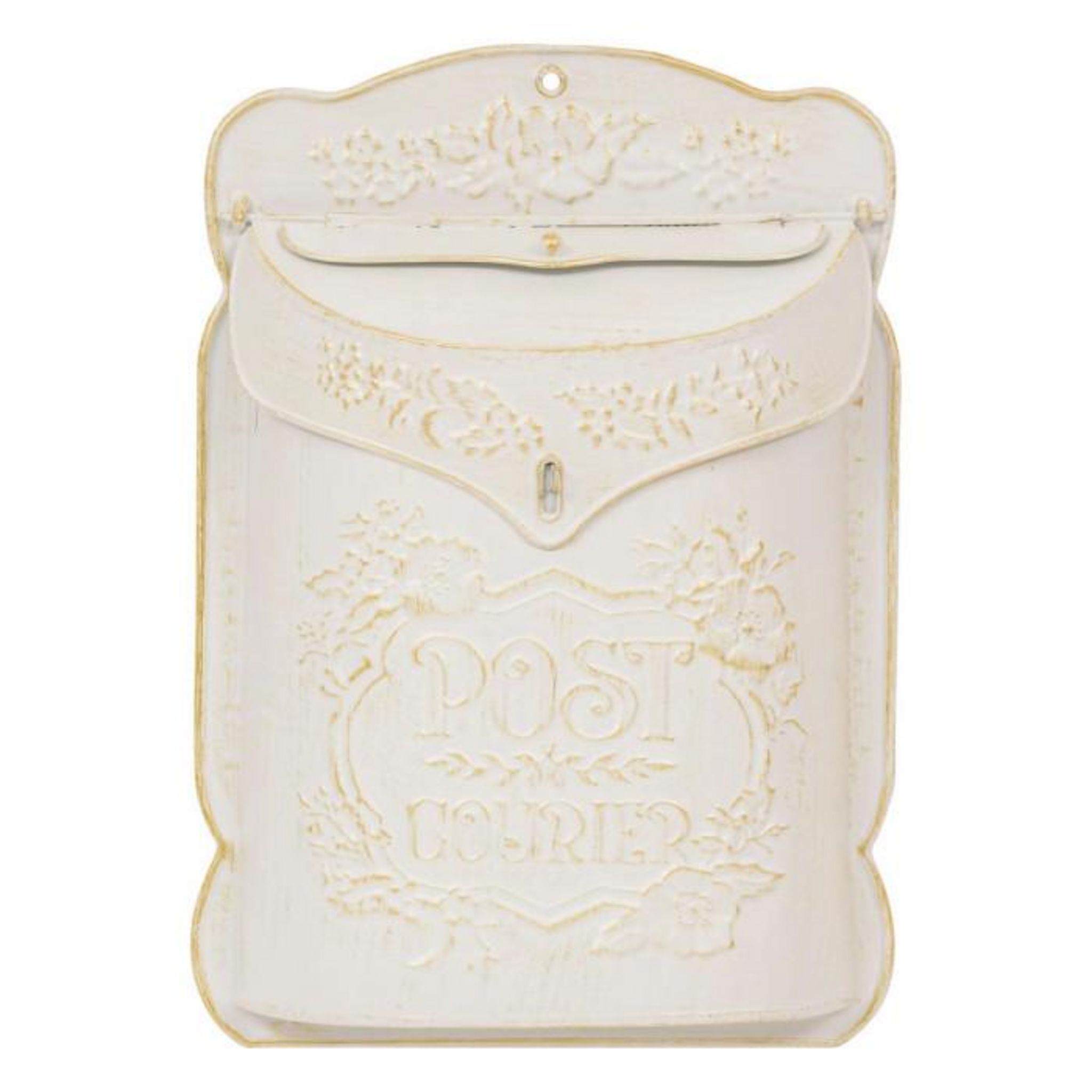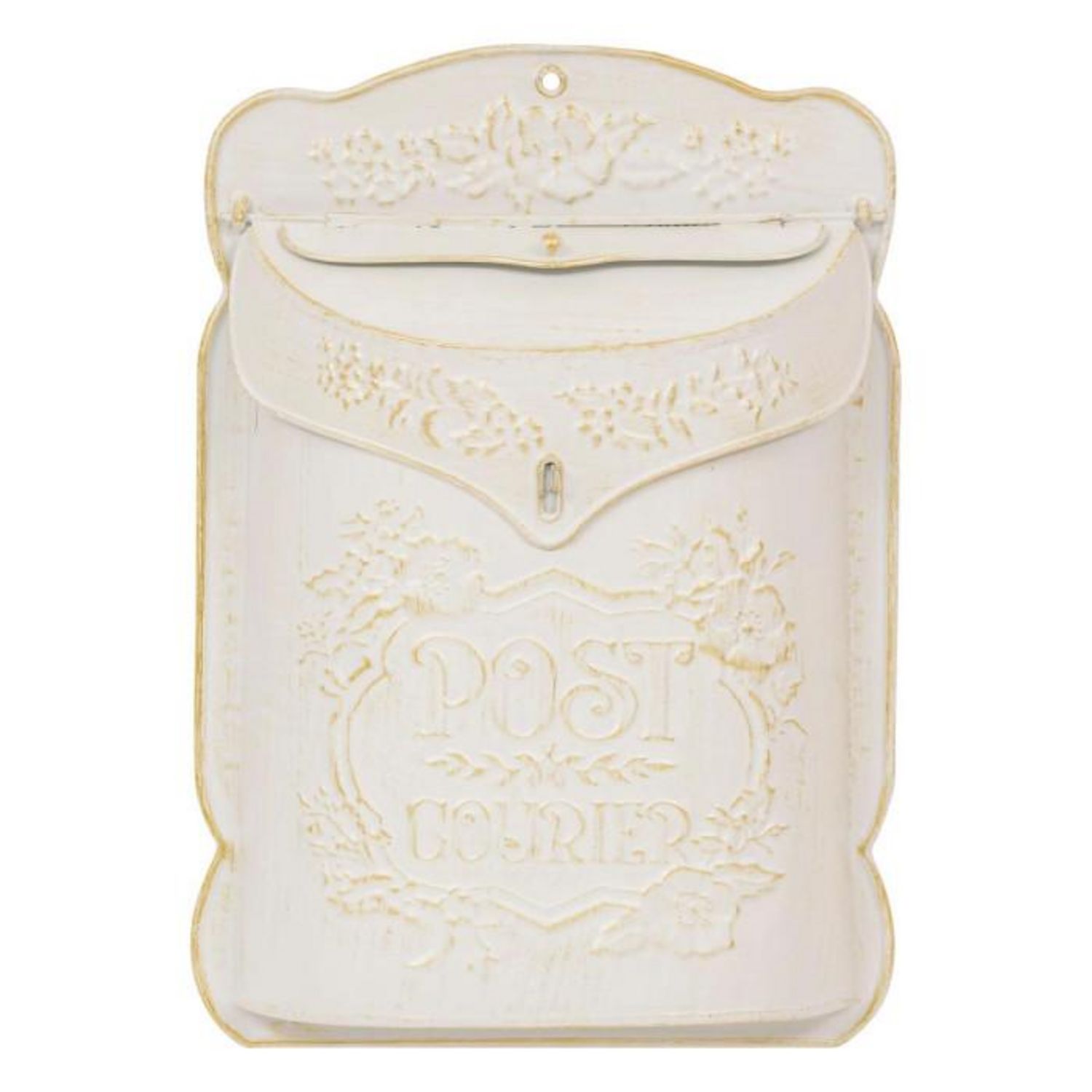 Informations Techniques : Dimensions : L. 28 x l. 9 x H. 40,5 cm Matière : Métal Spécificités : Déco & Robuste Boîte aux lettres à suspendre Inscription Post courier Motifs fleuris dorés Finition patine Poids : 0,85 kg Couleur : Blanc
