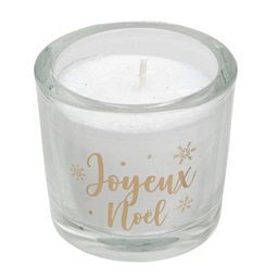 Informations Techniques : Dimensions : D. 6,5 x H. 5,8 cm Matières : Cire de palme & Verre Spécificités : Bougie déco Inscription Joyeux Noël Forme ronde Capacité : 60 g Poids : 0,23 kg Couleur : Blanc
