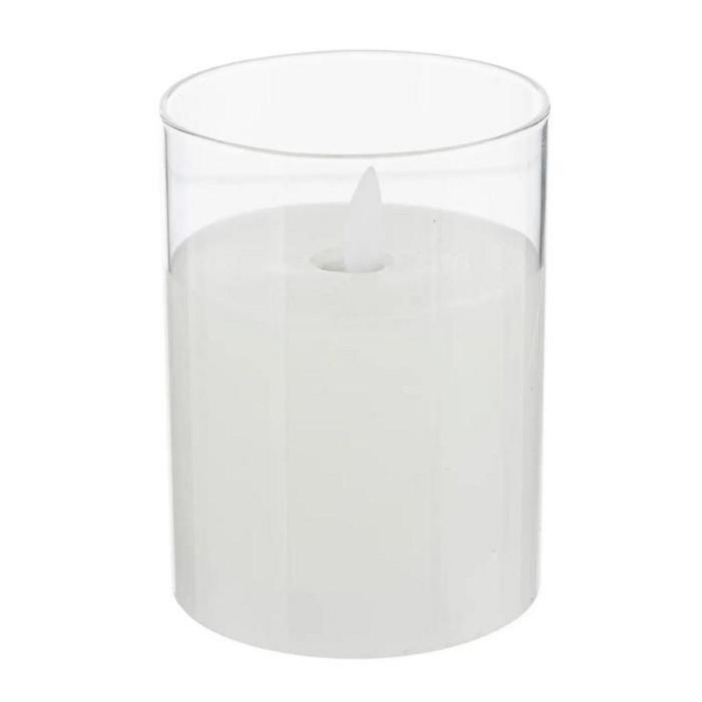 Informations Techniques : Dimensions : D. 7,5 x H. 10 cm Matière : Verre Spécificités : Tendance & Esthétique Bougie LED déco 1 mèche vacillante Éclairage blanc chaud Forme ronde Fonctionne avec 2 piles (non incluses) Type de pile : LR6 - AA - 1,5V Poids : 0,17 kg Couleur : Blanc