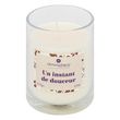 Informations Techniques : Dimensions : D. 8,6 x H. 10,4 cm Matières : Paraffine & Verre Spécificités : Déco & Originale Bougie parfumée avec bijou Inscription Un instant de douceur Bracelet signe lotus en acier inoxydable Parfum créé en France Huile de palme certifiée RSPO Senteur : Noix de coco C