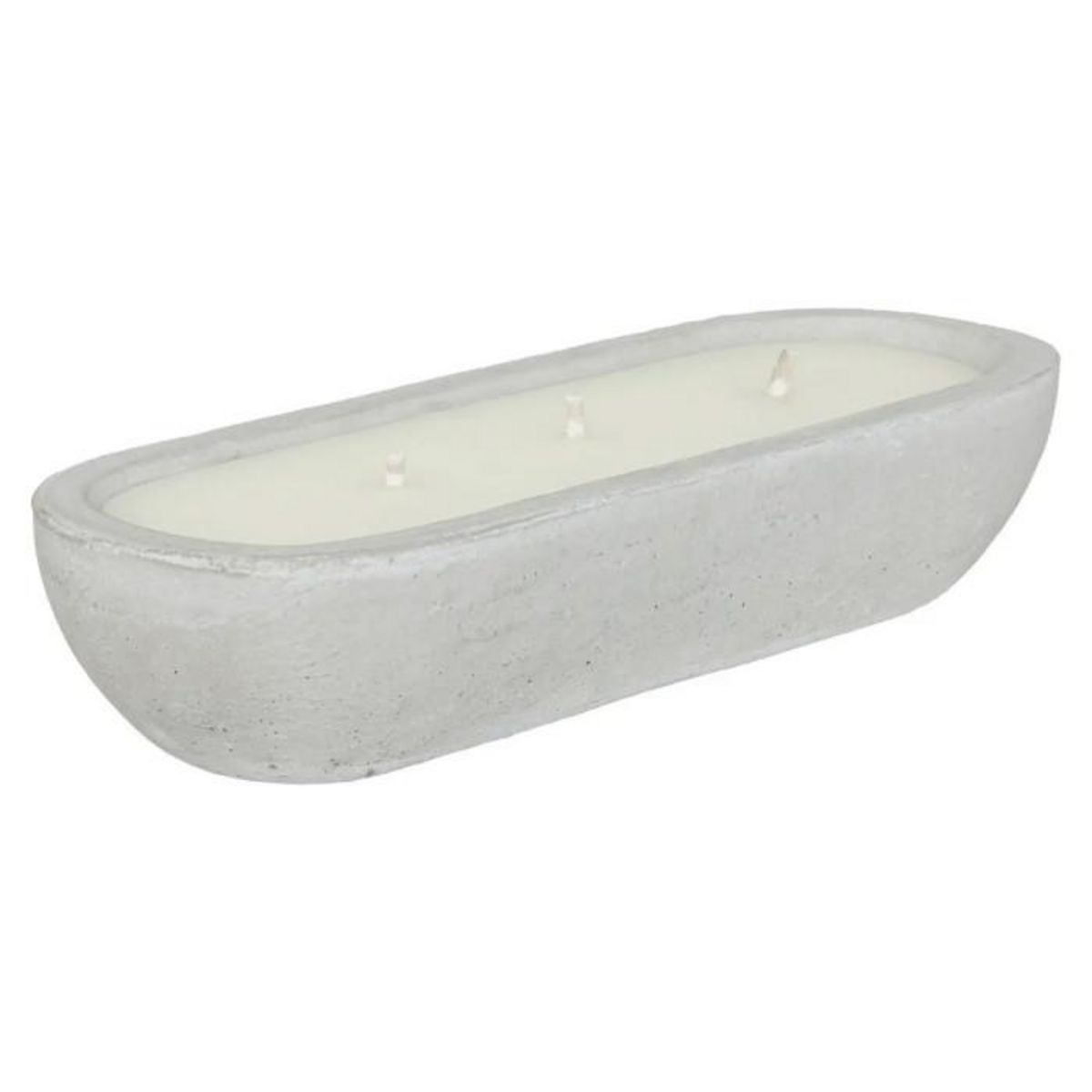 Informations Techniques : Dimensions : L. 40 x l. 15,5 x H. 8 cm Matières : Ciment & Paraffine Spécificités : Pratique & Utile Bougie parfumée ovale Avec 3 mèches Usage extérieur Senteur : Citronnelle Contenance : 580 g Poids : 3,47 kg Couleur : Gris