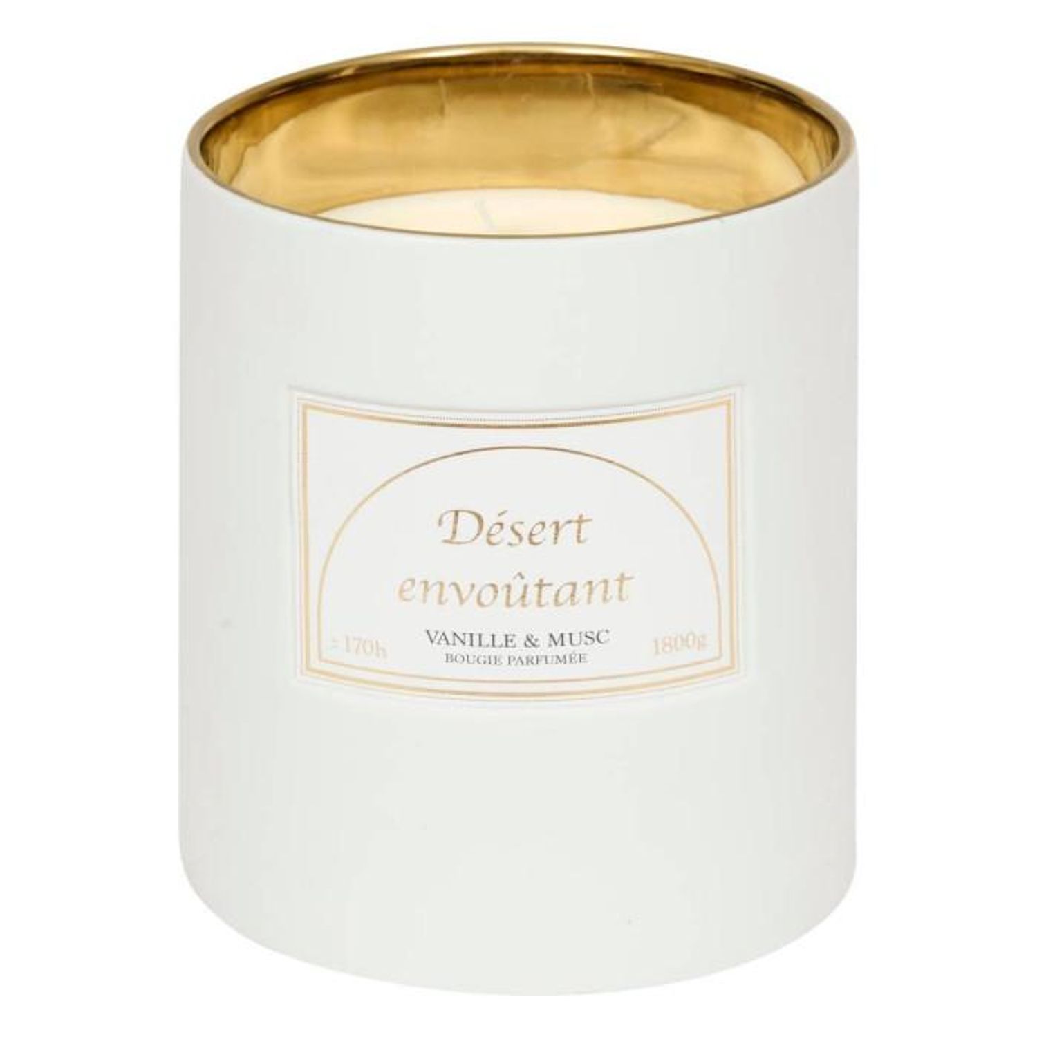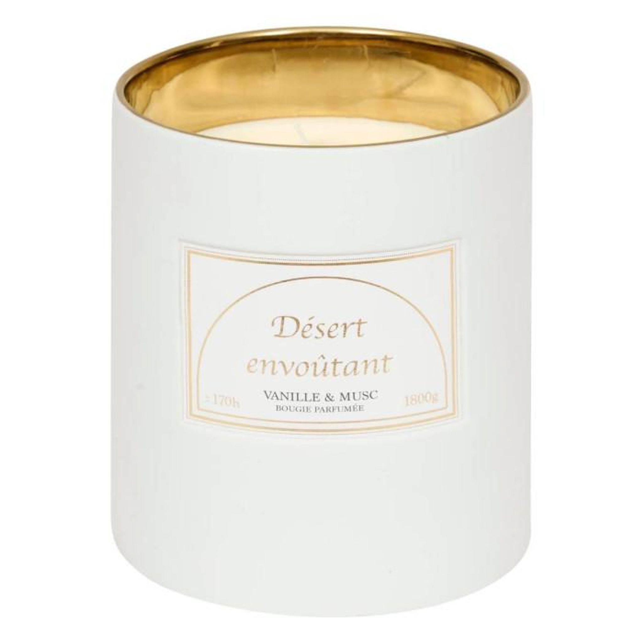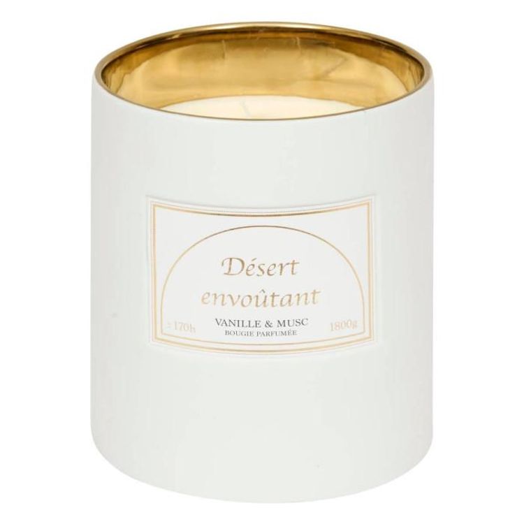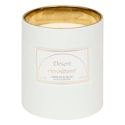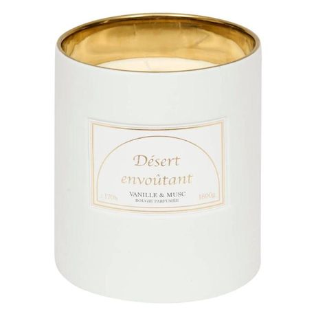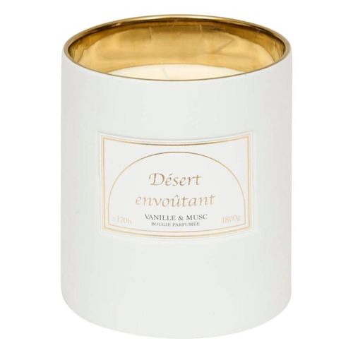 Informations Techniques : Dimensions : D. 15 x H. 17,7 cm Matières : Grès, Paraffine & Cire de Soja Spécificités : Élégante & Épurée Bougie parfumée cylindrique Inscription Désert envoûtant Senteurs : Vanille et musc Contenance : 1800 g Durée de combustion : +/- 170 heures Poids : 3,13 kg Couleur