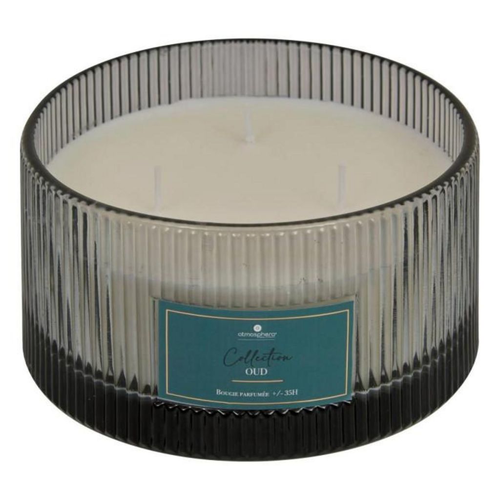 Informations Techniques : Dimensions : D. 15,1 x H. 8,1 cm Matières : Paraffine & Verre Spécificités : Déco & Élégante Bougie parfumée ronde Avec 3 mèches en coton Contenant en verre strié Parfum crée en France Senteur : Bois de oud Durée de combustion : +/- 35 heures Contenance : 635 g Poids : 1,47