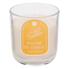 Informations Techniques : Dimensions : D. 8,3 x H. 9 cm Matières : Verre & Cire Végétale Spécificités : Déco & Utile Bougie parfumée Senteur : Poudre de vanille Capacité : 210 g Poids : 0,47 kg Couleur : Blanc