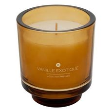 Informations Techniques : Dimensions : D. 9 x H. 10 cm Matières : Paraffine & Verre Spécificités : Déco & Élégante Bougie parfumée design Avec une mèche Pot en verre Parfum créé en France Senteur : Vanille Exotique Durée de combustion : 40 heures Contenance : 225 g Poids : 0,69 kg Couleur : Ambre