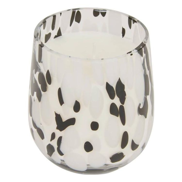 Informations Techniques : Dimensions : D. 9 x H. 10,2 cm Matières : Verre, Paraffine & Cire de Palme Spécificités : Déco & Moderne Bougie parfumée ronde Imprimé tacheté bicolore Parfum : Ambre Durée de combustion : 45 heures Contenance : 275 g Poids : 0,62 kg Couleur : Noir & Blanc